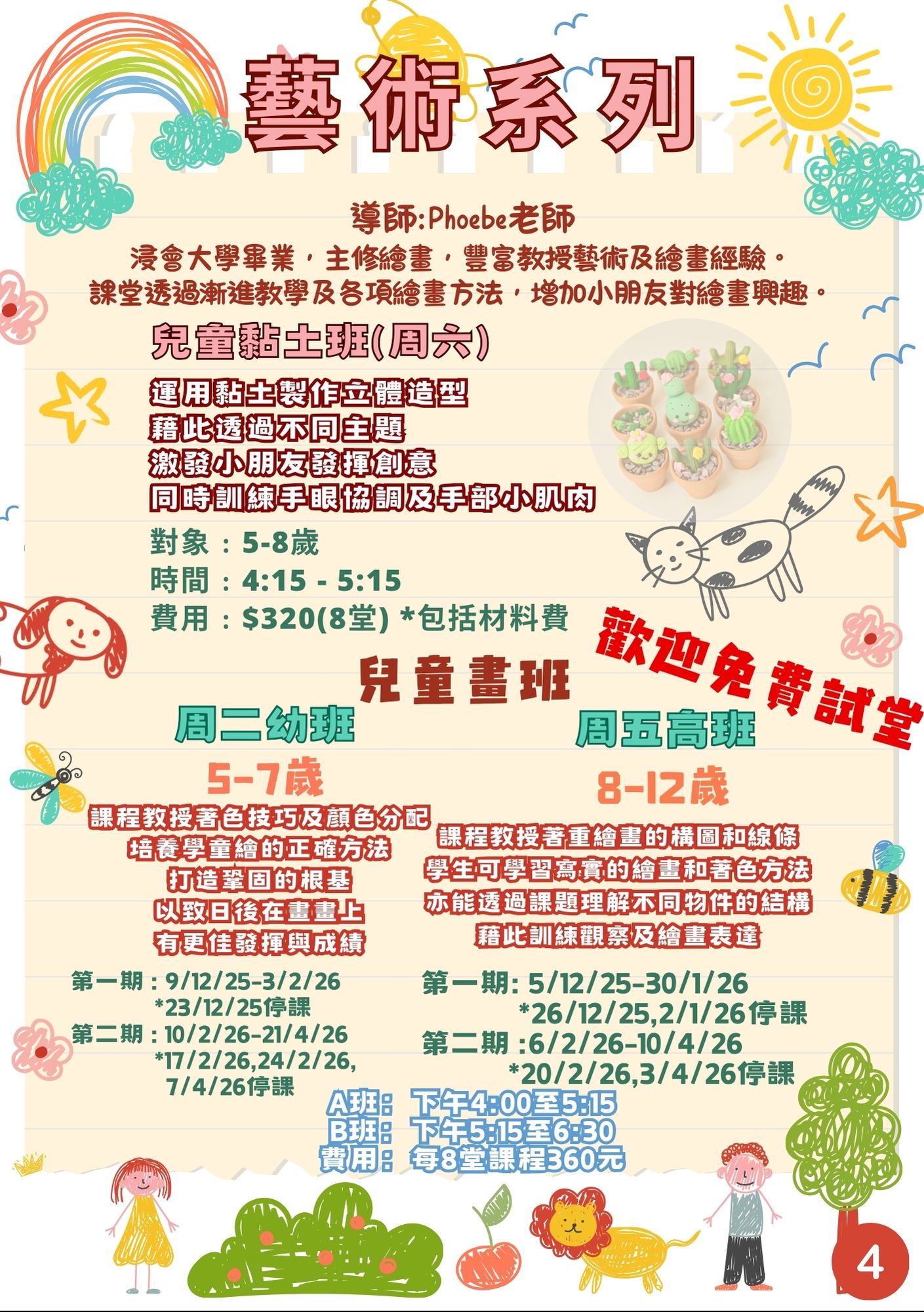 導師﹕Phoebe老師 浸會大學畢業,主修繪畫,豐富教授藝術及繪畫經驗。 課堂透過漸進教學及各項繪畫方法,增加小朋友對繪畫興趣。 現在未能成班,如有興趣可先留資料,待成班時再通知您。